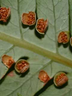 解説:低山地の多少陽当たりのある陰湿な場所に生育する大型の常緑のシダ類で、葉身の長さが2〜3mになる。川沿いに大きな群落が見られる。葉身の先端は急にすぼまり、先が少し鋭く伸びる傾向がある。胞子嚢群は2枚の包膜に包まれている。