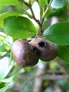 解説:山地の樹林内に生育する常緑高木。2月に開花。アブラムシ類によって大きな虫こぶができる。