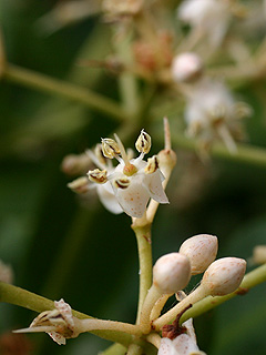花は白色〜ピンク色で、集散状の花序に多数つく。
