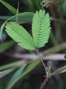 葉は二回羽状複葉。小葉は15〜20対の狭長楕円形の羽片からなり、2〜4枚の小葉が掌状に集まり葉になる。葉は夜間や刺激を受けたりすると閉じ、和名の由来となっている。