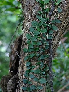 解説:林縁ややや明るい林内に生育する常緑のつる性低木。つるから出す付着根で樹上や岩上に登る。