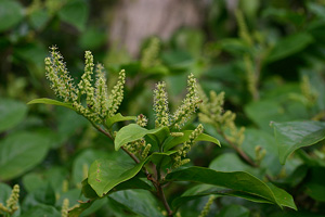 花は枝先や葉の腋から総状花序を出す。雌雄異株。西表島では11〜12月頃と3〜5月頃に開花する。