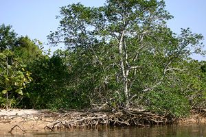 葉は互生し、厚い革質で、楕円形〜卵状長楕円形、縁は全縁である。ガジュマルの葉に似る。