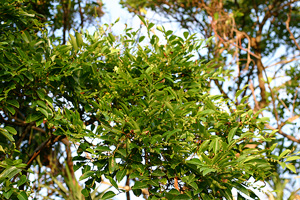 葉は互生し、革質で、両面とも無毛、倒卵形〜倒卵状楕円形、縁は全縁である。